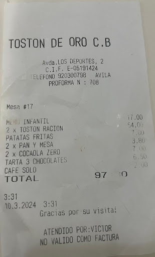 Read moreFuímos a almorzar a este restaurante atraídos por los buenos comentarios que tiene. Pedimos dos raciones de Tostón y un menú infantil. El Tostón estaba muy pasado, la parte exterior muy quemada, lo que hizo que la parte interior estuviera muy seca, vimos que los del resto de comensales de las mesas contiguas y los que veíamos salir de cocina estaban igual, así que no dijimos nada, dimos por hecho que en este restaurante se sirve así. Pedimos además un menú infantil compuesto por sopa de fideos (la pasta extremadamente pasada) y pollo empanado, cuando llegó el momento de pedir el postre del menú infantil nos ofrecieron los postres que tenían, el niño eligió uno y posteriormente vimos en la cuenta que nos lo habían cobrado (tarta tres chocolates a 6,5€), preguntamos y nos dijeron que ese postre no estaba incluido en el menú infantil... Calidad precio no...