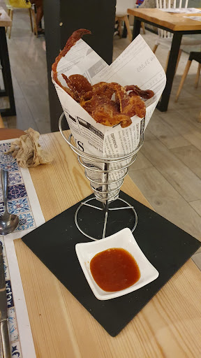Read moreTenía muchas ganas de ir a este sitio, pero normalmente suelo ir los domingos a Aracena, que es cuando cierra por descanso del personal, por lo cual no había tenido oportunidad hasta ahora. Pero la espera ha merecido la pena y ahora lo tendré en cuenta para mis próximas visitas a Aracena 😊. El interior es muy acogedor y está muy bien decorado. También tiene una pequeña terraza delantera y una gran terraza lateral. Dispone de gran variedad en vinos, yo como siempre recomiendo los vinos de la provincia 👌🏾. La vajilla utilizada y elegida con muy buen gusto. Un detalle, es que, te ponen una bolsita con el pan y picos y éstos son de una panadería vecina (La Molinilla), por lo que se agradece que apuesten por los productos locales y en este caso, productos de gran calidad. Todo lo que pedimos fue para compartir. Empezamos con un sándwich de salmón y salsa tártara, que venía en un pan brioche calentito 🤤, podría comerme 4 ó 5 iguales 😅, riquísimo, muy bien integrado todos los elementos. Continuamos con las patatas bravas, bastantes originales, pues no llevan el típico corte de patatas en gajos o dados; sino que, son unos chips de patatas caseros con su salsa brava, bastante picantita por cierto, cosa que me encanta, porque unas bravas tienen que saber a bravas 😋. Seguimos con un choquito de trasmallo frito con salsa tártara, que también estaba muy bueno, pero no fue lo mejor de la cena. Por último, pedimos un cartuchito de orejas fritas y bueno, brutales 😍, venía con una salsita kinchi (creo que era 🤔) para mojar, pero están tan buenas por sí solas que no tocamos la salsita. Todos los platos venían con una buena presentación y en cuanto al personal nos atendieron y recomendaron muy bien. El precio en relación a la calidad y la elaboración correcto. Si vas en primer lugar, no dejes de probar el sándwich y las orejas 🥇. En segundo lugar las bravas 🥈y en tercer lugar el choquito 🥉. En cuanto pueda volveré para probar más cositas, porque nuestra mesa estaba cerca de la cocina y la verdad es que todos los platos salían...
