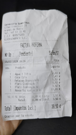 Read moreFatal. Revuelto de gambas y ajetes, viene con las gambas crudas, le pido que me lo pasen un poco y vuelve el plato igual, pero más caliente (se ve que lo calentaron al microondas pero las gambas seguían crudas).(Vaya, que venía con tres piquitos la primera vez y los mismos piquitos estaban la segunda vez, así que la sartén no la pisaron) Ahí se quedaron las gambas y el revuelto. Al pedir la cuenta nos extraña el precio. Revisamos el ticket y han cobrado de más. Se ve que las cartas eran las antiguas... Nos devuelven el dinero de lo reclamado. Pero un vaso de Cocacola a 2'40€ y una botella de litro de agua a 2'60€ me parece abusivo. Sobre todo porque la Cocacola me la sirvieron en el vaso sin lactosa botella ni nada. El personal muy atento y agradable... hasta que reclamamos. Los platos combinados estaban bien hechos, y las papas alioli buenas, tambien. por eso se lleva las 2 estrellas. Pero que no es un gambrinus como nosotros lo...