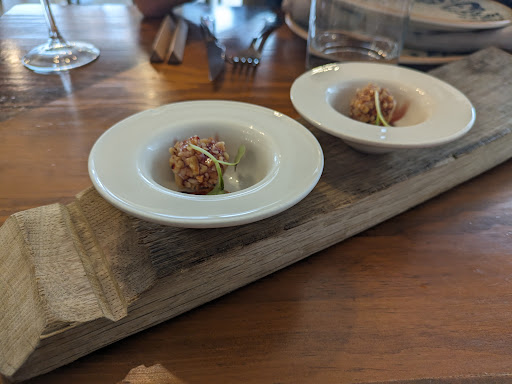 Read moreUnos 40€ por persona sin café ni vino. Local que pretende ser de alta calidad sin llegar a serlo, precios elevados para lo que es. Reservamos (domingo a medio día) a nuestro paso por carretera, por sus buenos comentarios en Google y la carta que habíamos visto. Pero al entrar solo nos ofrecen la carta que podéis ver en las imágenes, que nada tiene que ver con la de las fotos, pero al preguntar por otras opciones solo nos ofrecen otros platos fuera de carta.. Decidimos pedir chuletillas de cordero (fuera de carta)(ya que no hay opción de pedir cordero para solo una persona) y pescado para compartir con el niño. Para que diera tiempo a hacerse el pescado ya que eran las 14 horas pedimos unas croquetas de entrantes, las cobran por unidad 1.30€. Que estaban tanto las de boletus como las de jamón (abuela) muy ricas, aunque también caras al pedir una ración . 40 minutos después nos traen el rodaballo frío (llevaba mucho tiempo olvidado en el plato), y aunque el camarero lo intento lo destrozó (no consiguió sacar ni un lomo entero...), ya que estaba crudo por dentro y se lo tuvo que llevar nuevamente a poner a la brasa. (56.70€ por comer frío y destrozar el pescado, la segunda parte ya estaba caliente y bien hecha) Las chuletillas llegaron un poco más tarde, pero un precio excesivo por 7 cachitos de carne y hueso (23.70€) Mientras estábamos esperando al pescado vemos como en la mesa de al lado piden por otra carta y les ofertan, hamburguesa de carne, patatas fritas y otras opciones que a nosotros no nos han ofrecido aún preguntando por otras opciones. Respecto a los postres nos ofreció tarta de pistacho (8€) también fuera de carta con helado de pistacho muy rico y media ración de helado (1 bola en vez de 3, por la mitad de precio 3.20) Hay muchos más locales con mejor calidad y mejor precio, no repetiremos ni...