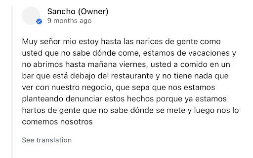 QUERIDÍSIMO Sr Sancho educación le falta y mucha... no miento ustedes no han hecho una ensalada nueva simplemente han retirado el atún y las aceitunas encontré restos de atún .... Usted mismo comprobó que no me comí la ensalada y no fue capaz de preguntar simplemente la retiro y la cobró en la cuenta .... Así que a quien no le consiento q mienta es a usted....Si, tenía otros platos pero viendo la ensalada no me atreví a pedir las otras opciones ....Y gente como yo? Soy una persona exactamente igual q usted a diferencia que no ingiero animales y en todo momento he sido cordial con usted a pesar de la sequedad y caras serias del servicio que aún pidiendo las cosas amablemente recibías una mirada intimidadora.... Y en ningún momento le hablé mal. Que tenga un buen día educación...