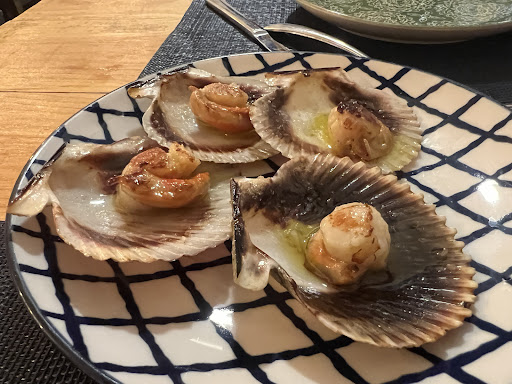 La cena: Zamburiña de 10 (productazo) bien en su punto cocinada. Pimientos de padrón ricos no muy grasientos y bien de sal. La ensalada de Tomate con encurtido de 10 el tomate insuperable….mejorando la visita anterior. Chipirones….bufff increibles!!!!