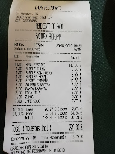 Chumy restaurante, que os podría yo decir de esta gran familia. Llegué a Aranjuez en verano desde Bilbao para hacer las practicas de empresa de la universidad y me fui con una nueva familia. Volvía de trabajar un día cuando vi un cartel de menú del día y dije vamos a probar (no soy muy de comer fuera), poco sabia yo donde me estaba metiendo. Desde el primer día tuvieron un trato que no tienen en un restaurante normal, la comida un espectáculo destacando como no, el cocido madrileño que ponen todos los lunes y por ultimo pero no menos importante buena música, lo que hace la comida mas amena. Resaltar la calidad de la comida, con gran cantidad y un muy buen precio. Poco se habla que fui un día para probar y acabe yendo todos los días que duraron mis practicas, excepto los martes que cierran por descanso lo cual convertía los martes en el peor día de la semana. Me gustaría mandar un abrazo a mis amigos del Chumy, Juli y Javi y obviamente también a todos los de la cocina por que me hacíais salir pensando, "que habrá mañana para comer". Muchas gracias por hacer esta estancia en Aranjuez mucho mas amena y espero volver a veros, para mi ha sido una...