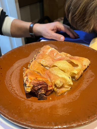Thanks to a great tip from a great reception clerk at the NH Collection Palacio Aranjuez, we decided to begin our evening meal at El Tomate. The facade with the artistic tomato and the mixture of elegance of the dining room and more informal larger area with smaller tables and bar stools made a very good first impression.