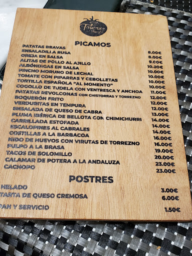 To tell you the truth, I was coercing more. I had dinner at their restaurant “El Tomate de Aranjuez” and the experience was superb. Magnificent food, excellent service and supreme atmosphere. La Taberna lacks on all three. The food is uninspiring, the service is ok and their is not much of an atmosphere. We started with a Gin&tonic. It seems like the waitress had arthritis, as she hardly poor any Gin. We ordered Torresnos (it was just pork rimes. I’ve got better at the corner bar)and Pincho de Lamgostinos and Rape (they were truly delicious).