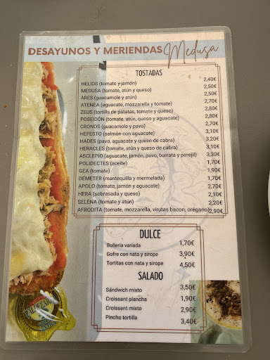 Tosta Artemisa (solomillo, cebolla y queso) Tosta Medusa (gulas, gambas y alioli)