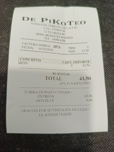 Read moreI have been dining in some of the bars in Aranjuez for many years now, and for those of you searching for a culinary experience like no other, look no further than PIKOTEO. Its simple decor allows the simplistic beauty of the food to really shine. The servings are big and more than good value for money. There’s no doubt eating out at PIKOTEO has quickly become my hottest...