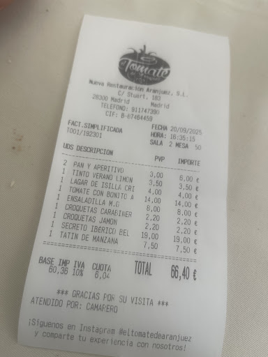 Thanks to a great tip from a great reception clerk at the NH Collection Palacio Aranjuez, we decided to begin our evening meal at El Tomate. The facade with the artistic tomato and the mixture of elegance of the dining room and more informal larger area with smaller tables and bar stools made a very good first impression.