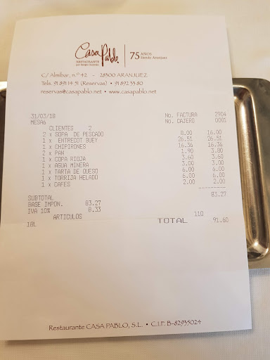 Read moreSábado 08 de julio 2023 (20:10h) Restaurante Casa Pablo CIF B82935024 Calle Almíbar, 42 28300 Aranjuez