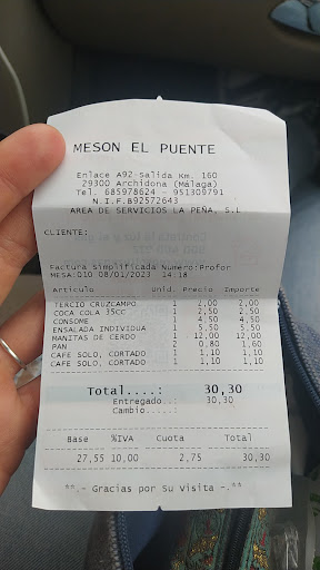 Hay unos 3 camareros para el salón de adentro, no había nadie sentado fuera ya que estaba lloviendo, la atención recibida ha sido buena, como recomendación si dividierais el comedor en sectores los camareros estarían mejor organizados y los clientes súper bien atendidos, aunque la atención fue bastante buena. Pedimos un café con leche y un solo, pusieron el solo y un cortado no somos de aquí asique posiblemente el error de pedirlo haya sido nuestro que no nos hayamos explicado bien. Pongo foto de la cuenta total, la comida está muy bien y precios muy asequibles. Muy buen sitio y al lado de la a-92 si estás de paso. Esto no es para el restaurante sino para los demás clientes: Cuando uno llega al restaurante se espera en la puerta o recepción en caso de que la tenga, intenta visualizar a algún camarero es paciente y espera a que se acerquen a usted y le digan dónde sentarse, bajo ningún concepto usted puede saltarse la cola de los que están esperando y sentarse en la mesa que le venga en gana, cuando ve perfectamente que la mesa no está montado y la acaban de retirar, un poco de respeto a los que trabajan en la hostelería si tienes hambre vas antes, si tienes bulla por comer hechas paciencia, alomejor esa mesa está reservada para la siguiente hora, no les interesa montar esa mesa por su localización o simplemente van a cerrar cocina y ya no pueden seguir atendiendo, no ha sido el caso, pero esta gente se merece respeto, no son máquinas...