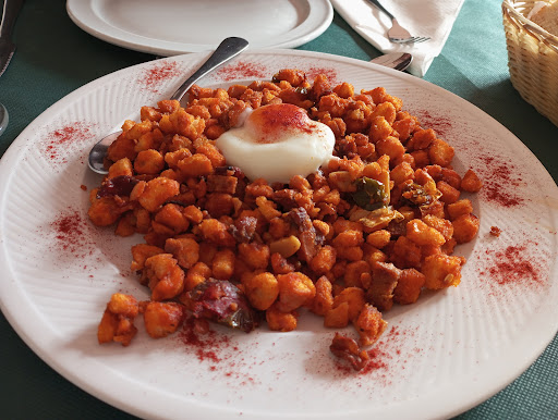 La verdad es que no puedo decir que comieramos mal, pero desgraciadamente no fue una experiencia grata. Antes de pasar al comedor tomamos un aperitivo, que acompañamos con unas patatas revolconas y unas migas que ya nos dieron ciertos indicios de lo que unos minutos después nos íbamos a encontrar en la mesa.