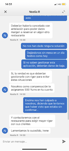 Read moreTras realizar una reserva a través de El Tenedor y presentarnos allí a la hora indicada, cuál es nuestra sorpresa cuando nos dicen que no hay ninguna reserva, que es noche de cambio de menú y que no nos atienden. Tras abandonar el lugar en busca de otro restaurante que nos atienda, compruebo que tengo el correo de confirmación de la reserva (me quedo mam tranquila, no me he vuelto loca). 5 horas después, de madrugada, cuando intento "valorar mi experiencia" en el restaurante, recibo un correo de CANCELACIÓN DE LA RESERVA, así sin más, con lo cuál mi "experiencia" no es publicada (solamente se puede opinar si has hecho efectiva la reserva y, por tanto, has comido/cenado en el lugar; al cancelar el restaurante la reserva, no es publicada). Lo que más me molesta de todo es que, encima de dejarnos sin cenar, me hayan tratado de mentirosa, para después, acabar cancelando lo que, según ellos, no existía; y todo para evitar que pueda dejar una...