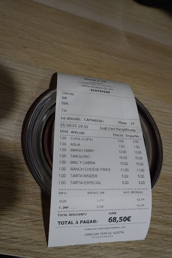 Read moreLas hamburguesas están buenísimas, aunque tengo que decir que parecen más grandes cuando ves las publicaciones en redes sociales. El servicio nefasto, lento, con la barra llena de bandejas y recipientes sucios a lo largo de esta. Llamé para reservar diciendo que una persona era intolerante al gluten y cuando llegamos lo primero es que no tienen cerveza de celíacos, que a estas alturas me parece un retraso y como nos dijeron que tenían pan de celíacos y cuando llegamos le recordamos lo de la intolerancia, va y me dice la camarera que cree que no le quedan porque tenía solo dos ese día y que creía que los había servido, menos mal que tuvimos suerte y les quedaba uno, pero vamos que reservas con el tema de la intolerancia y les suda el nabo, cuando llegas a lo mejor tienes pan, o a lo mejor se lo ha comido su primo. Cuando llegamos había menos de la mitad de la sala ocupada y aún así la barra a reventar de bandejas y platos sucios con restos de comida. Las camareras lentas como caracoles cojos, hay poco personal, una chica en la barra y otra en la sala pero vamos, de un infarto no sé mueren, son lentas a más no poder. Tardaron como una hora desde que pedimos las hamburguesas hasta que nos las trajeron. El ambiente con mucho humo, nada más entrar ya había mogollón de humo en la sala, los suelos rotos y levantados, el local sucio, lo poco que se veía de la cocina era un mueble de Ikea de pared viejo y mugriento, las mesas sucias y no nos pasaron ninguna bayeta. Un sabor agridulce porque tenía muchas ganas de comer hamburguesa allí pero ya al entrar y ver todo sucio y con humo ya vas pensando en que la has cargado al entrar allí. Recomendación: pedir para llevar y comerlo en casa. Enhorabuena por el marketing porque lo habéis hecho muy bien, luego llegas y te llevas la ostia, pero el caso es que al final vas y consumes,. asique enhorabuena por esa parte. Si eres de Arganda y no te importa comer sin prisa en un local de batalla está genial porque la comida como os digo merece la pena. Yo soy de fuera, fuimos aposta y no voy a volver. En todo caso un globo y que me lo traigan a casa. Javito, mucho lirili con las hamburguesas pero hay que poner hincapié en el local y en el servicio. He trabajado en hostelería y tienes que tener gente con sangre, ganas y prisa en sala y en barra. Lo dicho,...