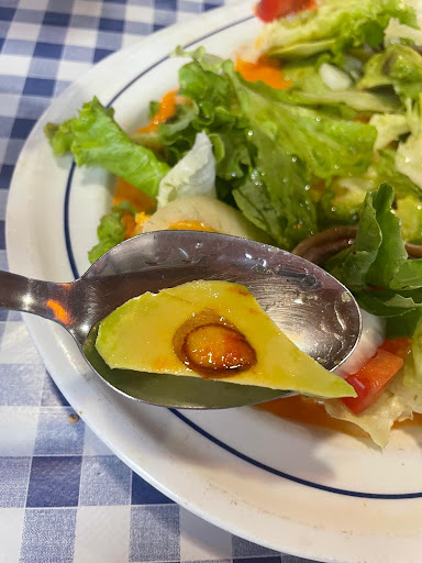 Veinte minutos más tarde nos trajeron las ranas y una “ensalada” que resultó no ser de langostinos, ya que se habían acabado. La sirvieron “con lo que había en cocina”: cinco anchoas y un trozo de aguacate duro con parte del hueso. Nadie nos consultó si queríamos cambiar el plato; solo nos dijeron que harían “un pequeño descuento proporcional a que no había langostinos”.