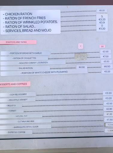 Ich war der erste und einzige Gast etwas nach 13 Uhr und wurde innerhalb von 5 Minuten serviert. Das alleine hat mich stutzig gemacht. Ein Teller mit drei Teilen von einen alten zähen trockenen 3 Fach getötenen Hahn vom Vortag noch mal in die Fritteuse geschmissen und einen Salatteller der hauptsächlich zu 90% aus Kartoffelsalat bestand. Nach 3 Bissen ließ ich das stehen. Das Personal blickt abwesend und ohne jegliches Lächeln oder Freundlichkeit durch die Gegend. Job verfehlt. Es war meine falsche Wahl mein Geld hier auszugeben. Wenn man schon nix anders als Hähnchen auf der Speisekarte hat, dann sollte das auch wirklich gut und frisch zubereitet sein. Reste vom Vortag gehören in die Mülltonne. Das Restaurant nimmt keinerlei Bankkarten an. Kein Problem: ich hatte einen 50 Euro Schein im Geldbeutel. Aber sie wollten den Schein nicht annehmen weil kein Wechselgeld in der Kasse war. Meine Rechnung war 12,10 Euro. Schließlich fand ich glücklicherweise noch ein paar Münzen und einen 5 Euro Schein in der Hosentasche um die Situation nicht zu eskalieren. Das Restaurant hatte sich geweigert das Wechselgeld irgendwie selber aufzutreiben. Das wäre meine Verantwortung. Was für ein erbärmliches Management. Die kategorische Nichtakzeptanz von ganz gewöhnlichen Mastercard oder Visa Bankkarten in einem touristischen Ort ist schon ein starkes Stück an sich und das spanische Finanzamt hellhörig machen. Die Rechnung wurde ausgedruckt als „Factura simplificada“. Kenner der Materie wissen was das bedeutet. Es bedeutet nichts was nicht storniert...