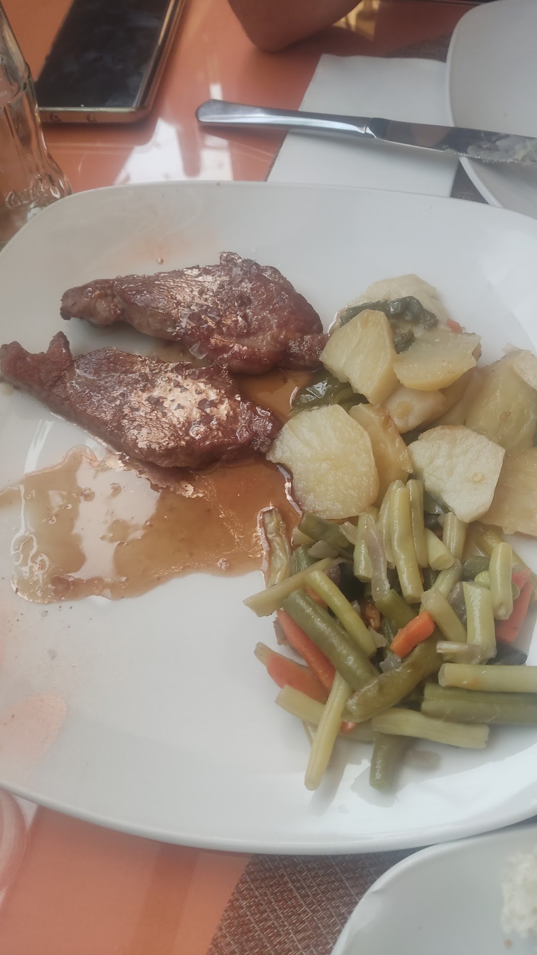Unos huevos rotos, una croqueta congelada grande, y un plato de pluma, con dos bebidas y un café (que nos cobraron doble sin haberlo pedido) 46 euros, a esas alturas ya por pagar e irme ni le iba a discutir un euro arriba o abajo por el café, pagué y decidí irme cuanto antes.
