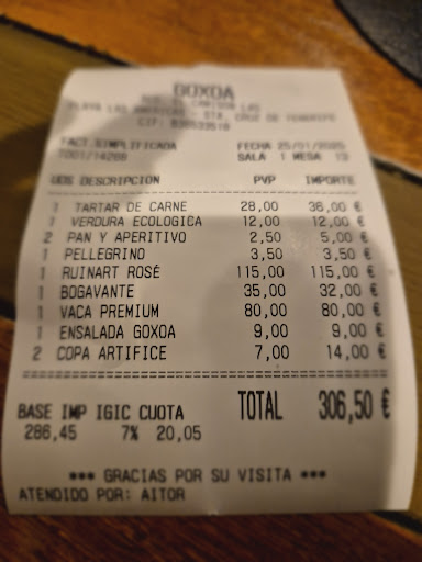 Read moreGoxoa ha sido galardonado muchas veces e incluso ha recibido laureles de la Guía Michelin. El servicio es discreto, cortés y nada intrusivo. Los tiempos de espera entre plato y plato me parecieron ideales. Después de pedir, el tiempo hasta el primer plato se salvó con un amuse-gueule, un pequeño carpaccio de ternera, acompañado de pan, sobrasada, mantequilla ahumada y aceite de oliva vasco. Todo salió a pedir de boca. Nuestros entrantes cumplieron nuestras expectativas, el tartar de atún estaba sencillamente bueno. Atún de la mejor calidad discretamente sazonado, muy bien presentado, ¡casi demasiado! La Ensaladilla de Cangrejo con patatas se prepara en la mesa, mi paladar estaba satisfecho, deseaba un poco más de picante solo que no a todo el mundo le gusta el picante. Mi plato principal, un filete de ternera bleu chaud estaba cocinado exactamente como lo pedí y caliente por dentro. El trozo de filete de ternera bien sazonado era ciertamente de 250g y tierno como la mantequilla, simplemente excelente, uno de los mejores cortes de carne desde hace mucho tiempo. Goxoa tiene una pequeña carta, se ofrecen diferentes menús, es posible pedir un solo plato de un menú. En Goxoa, el ojo come contigo, todos los platos se preparan con amor y habilidad. Me complace dar 5 estrellas a la comida y al servicio. En cuanto al ambiente, me molestó el hecho de que algunos clientes hablaran constantemente por teléfono. Creo que es una pena que la gente no se concentre en lo esencial de una buena comida, es decir, comer y estar juntos.