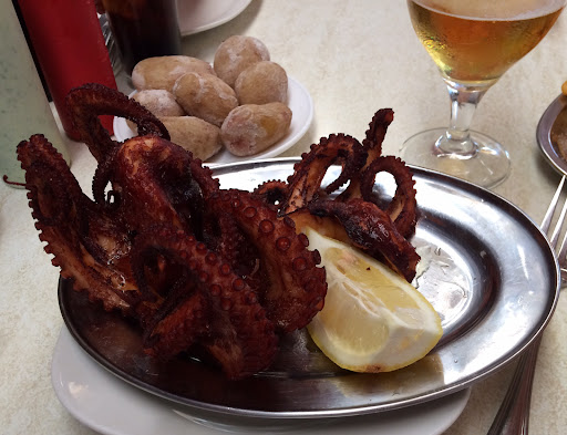 Visited here on a Friday lunchtime. Got there just in time to get the last table without waiting. Thereafter, as others have mentioned they queue down the alleyway. Quite a noisy bustling sort of place, with lots of Spanish people. Limited choice as expected. Sea food only (though they do as as a sop, chicken wings for those who don't like fish). I chose fried octopus. This was a whole octopus and was a generous portion. I thought mine was tasty. My partner chose grilled hake. She said it was ok, and I have to admit looking at it and tasting it, I've had much better elsewhere in Spain and Portugal. These were only €8 or €8.50. We had a portion of canarian potatoes and fries and some bread. Couldn't eat all the potato and bread - too much. They also did a rather nice Dorado Especiale beer. So I had two. I'd eat herr again, but wouldn't chose the hake, which surprisingly given the ratings on here, we were suitably underwhelmed about. As regards the waiters, they seemed happy enough, sort of highly efficient. I didn't...