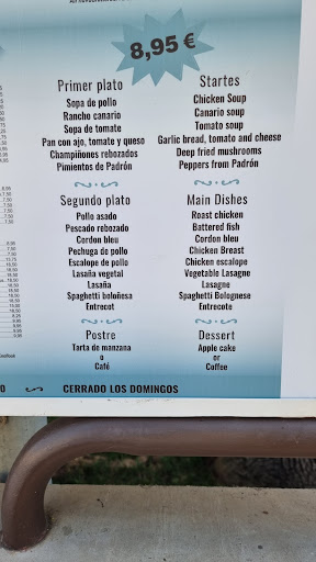 My wife and I checked out the reviews before deciding to visit this restaurant. On arrival we were met by a cheerful waitress who asked us if we wanted to sit inside or out, we wanted to be outside. The only table available had the debris of the earlier diners on it, including stains on the tablecloth. We sat down at this table and the cutlery was taken away leaving us sat at a completely empty table, which is how it stayed. I ordered fried camembert as a starter, which arrived in a huge dish which made the 4 slices of cheese look lost. I was furnished with a knife and fork as the dish arrived, but the cheese was luke warm. We ordered the entrecote steaks, my wife chose the pepper sauce with hers and I chose the straight fried steak on its own. We selected the potatoes rather than chips. My steak was very thin but cooked medium/rare as I wanted, I suspect that it had been frozen as no blood came out of it. It was ok but nothing special. The baked potato was the smallest I have ever seen and as dry as a bone, the 'veg' was cabbage, 1 slice of carrot and a single slice of red pepper. All together the veg was bland. The boiled Canarian potatoes that came on a side dish were tasteless and disappointing.