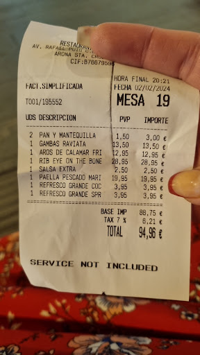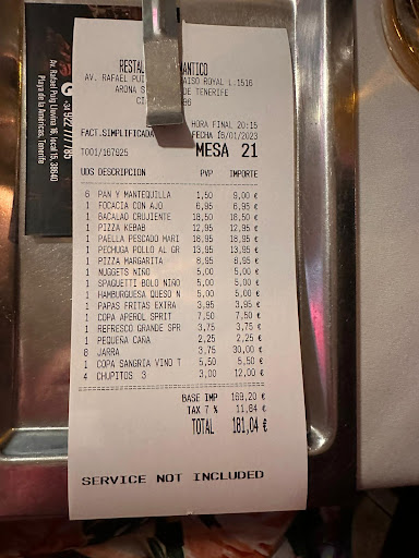 Next, the bread arrived which we didn't order. But I understand that bread is customary in Spain. However, usually in more...reputable establishments, this is free, if it's not it should be stated before it's brought out. If it's a charge then it should NEVER be brought to the table unprompted