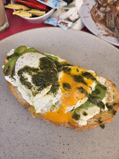 We ordered pouched eggs on toast with avocado, cream cheese, basil olive oil. The little one had pancakes and chocolate.