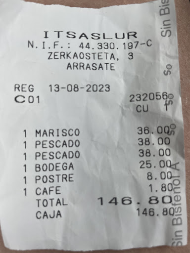 This is a scam restaurant. We came upon this restaurant while walking around Arrásate on a Sunday. Unfortunately we went in without looking at any previous reviews and yes we were scammed also. The lady had no English and our Spanish is very limited so we thought she was being extra patient and helpful in ordering. We had asked her for a menu but there are none available. We ordered a bottle of white wine. We got 10 grilled gambas for starter to share which were nice. Then we were served a piece of cod each in a yellow sauce. No vegetables or potatoes just cod. Then a small basket of 5 pieces of bread was left on the table. Postre was a slice of cheesecake to share and I had a coffee. Up to this point we were happy with the food and the service even if she was a bit strong minded and we felt bullied into what she wanted us to order. We then asked for the bill. I saw the bill on the table before my husband and I was shocked but not as shocked as him. He thought he was reading it incorrectly so he had to get his glasses. €146.80 for 10 gambas, two pieces of cod, one cheesecake, one coffee and a bottle of wine. Outrageous. The 10 gambas were €36 and the cod was €38 each. We did not argue with her as our Spanish is not good enough and we were not going to win with her. We should have asked for prices before we ordered but we honestly thought it would be average pricing for this area. Hopefully you will have read this review BEFORE you enter this restaurant and my advice is DO NOT GO IN. I thought it was just a scam on English speaking tourists but from reading all the bad reviews it’s a scam on...