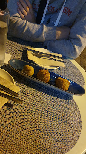 The croquettes were jamón iberico, for some reason they cooked the cured ham before they mixed it into their Bechamel. This makes the ham very chewy which could be tolerated if the pieces were smaller but they put chunks in there. Then I had a chunk of cartilage that was inedible I had to spit out. If they had sliced the ham properly they would have discovered this large chunk of cartilage about the size of one of my teeth. The Croquettes were also very salty. Before I go on please understand I was a professional chef years ago and I have a high tolerance for salt as do most chefs.