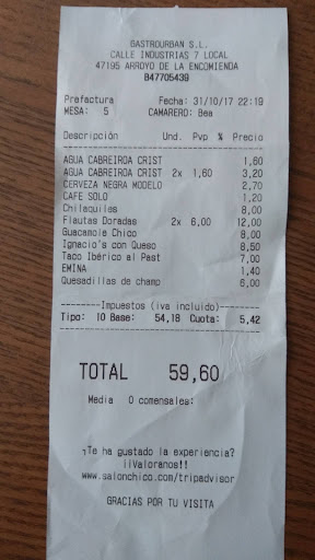 Read moreNos ha gustado mucho. El salón chico, está dentro del bar "Te Urban bar", es un saloncito con 6 mesas muy bonito, ambientado a lo Mexicano y con música del estilo. La comida nos gustó muchísimo y llena. Nuestros Ignacios: riquísimos!! Cochinita Pibil: vienen 2 así que les compartimos, están muy bueno, pero con toque picante. Quesadillas de costilla de barbacoa glaseada y queso Oaxaca: vienen 3 por lo que también las pudimos compartir. Una delicia, también con toque picante. Bebida: Margarita. Pues lo que es 😅, me vino muy bien para sentir menos el picante . Servido muy bonito en copa con el borde de sal y una rodaja de lima. Postre, tarta de queso: muy buena y consistente. También pedimos 2 cervezas con limón. Precio: 51€ La camarera super atenta y simpática, nos explicó todo ya que era la primera vez que...