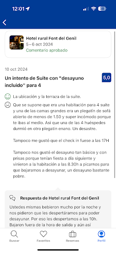 El engaño del "no reembolsable" El día 5 de octubre busqué en Booking una casa rural para ir a pasar parte del puente del 12 al 15 con mis hijos en La Cerdanya. Ellos trabajan hasta el 13 a mediodía. Encuentré una casa en un pueblo muy tranquilo y la reservé del 13 al 15. A las 14,46 me llego el ok de Booking a esa casa. Me voy a comer y al cabo de un par de horas volví a buscar con la intención de reservar una noche, del 12 al 13, por la zona del Cadí, en este caso solo para mi mujer y mi hijo pequeño. Cambié fecha y número de personas y encontré en este hotel rural un lugar adecuado para pasar esa noche. Cuando formalicé la reserva..... ¡sorpresa! me llega de Booking una reserva para el día 5, o sea para ese mismo momento. Eran las 17,07. Llamé inmediatamente a Booking, les expliqué el error y me dijeron que se comprometian a arreglarlo al momento. A las 17,28 me confirman que han hablado con la casa rural y que ponen pegas al reintegro. No me lo puedo creer. A las 17,29 me llega un mail de Guillem explicandome con todo detalle lo que tengo que hacer para acceder, que si el wifi, que si lo otro, que si el parking del pueblo. Huele a mucho morro tanta sincronización. A las 17,47 mail de Booking para ver que tal lo ha hecho el empleado con el que he hablado por teléfono sobre este tema. Flipo. El día 6, a las 7,04 de la mañana recibo dos mails, uno de Booking certificando que no es posible el reintegro. El otro en el que los señores del Hotel Rural Font del Genil preguntan si me presenté al checkin porqué ellos no tienen constancia de ese hecho. Cuanto numerito para quedarse con 72 euros. Hoy, día 9, por fin los habéis cobrado, he esperado a escribir esto por si teníais algo de dignidad y no lo hacíais. Antes o después os prohibirán el cobro por adelantado, mientras, no contéis conmigo más que para hablar mal de vuestras técnicas de garantía de cobro. Hasta nunca.