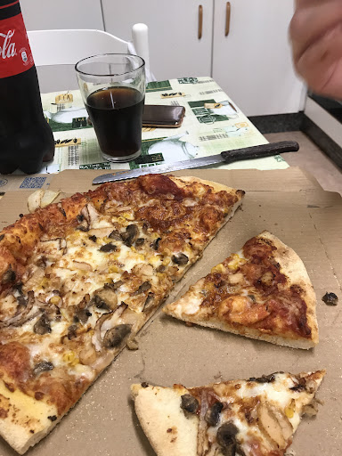 Empezando por la higiene, diré que he visto kebabs más limpios que este local (sin ofender a los Kebabs), este Domino's estaba extremadamente sucio, con manchas aceitosas por el suelo y las paredes, mesas a mal limpiar, y los baños ni los quisimos mirar.