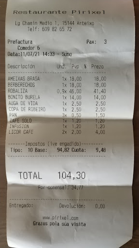 Read moreEspero que mucha gente lea esta reseña porque sitios así no merecen ni la valoración que tienen ni estar abiertos, no es ser maleducados, es ser malas personas. Llame hoy para hacer una reserva para comer y me dice el dueño que tiene una mesa cerca de la barra, a lo que yo pregunto si la mesa está bien ya que nunca hemos ido al restaurante. Me pregunta abiertamente si hemos ido alguna vez y le digo que no, y me dice: si eres de fuera prefiero que no vengas a comer que ya es bastante esta zona de tránsito como para que vengáis de fuera y que me sienta yo incómodo dándote de comer. Si lees esta reseña, que sepas que soy de Coruña, simplemente nunca había ido a tu restaurante, ni iré. El trato recibido por tu parte no tiene ninguna justificacion. Aunque fuera turista, precisamente es el turismo lo que mantiene negocios como el tuyo a flote. Solo espero que esta reseña llegue a gente, igual que a mi me ha llegado tu...