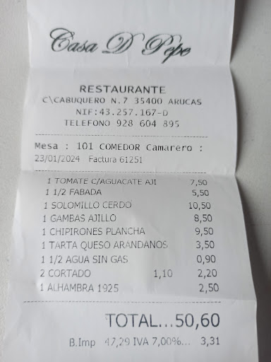 Read moreNormal, tanto la comida como el lugar. El servicio correcto y amable. Fuimos por las reseñas, pero como he leído en alguna otra reseña, exagerado. Las raciones normales, las medias escasas y si que me llamó la atención que una media de carne de cabra, de seis trozos pequeños, cuatro eran huesos, tal cual. Estuve a punto de comentarlo pero supongo que eso se ve al preparar el plato... Los tollos, sabemos que son peculiares, pero...no nos gustó demasiado.Nos ofrecieron los postres, elegimos el polvillo Uruguayo y al momento volvieron para decirnos que no les quedaba. Era muy temprano, creo que ni las 13'00 horas y éramos los únicos clientes, difícil que se hubiera acabado🤔. La tarta de...