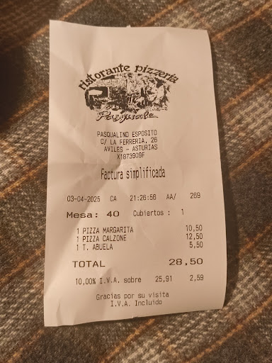 Hacía varios meses que no visitaba este icónico restaurante de ambiente familiar y comida tradicional italiana, pero hoy, 03/04/2025, decidí encargar un pedido para pasar a recoger: dos pizzas y un postre.