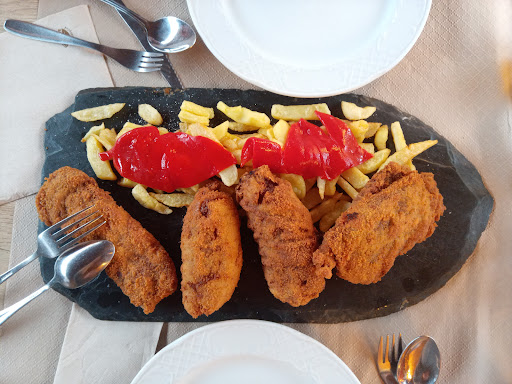 Huge cachopo, delicious. I ate a whole one (some people order it to share). The one I ordered was the house one, for me the best of the six varieties they make, a thin, well-palmed fillet stuffed with ham and a slightly blue but very soft cheese. The fillet is folded over the filling like a book and without the heaviness that the batter would imply, and it is grilled. They accompany it with long fried potatoes with piquillo peppers,...