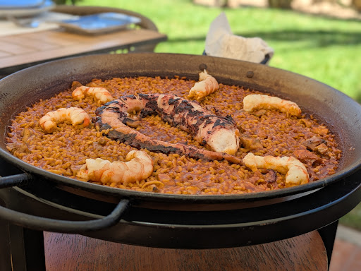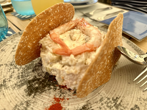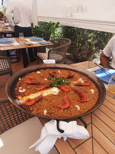 Read moreArroces simples, un poco salados y algo escasos para un restaurante especializado en la materia. Siendo 5 comensales, pedimos 2 entrantes y arroz para 6 personas (para uno más), y otros 2 postres. Y aún así, nos quedamos con apetito. Empezamos con una ensaladilla de gambas de huelva, riquísima, y con una ensalada mixta, ingredientes muy variados y contundente. Aunque cuentan con muchas opciones de arroces y fideuás, nos decantamos por el arroz negro, correcto de sabor, algo caldoso; y el arroz de marisco. Sin embargo, se nos sirvió un arroz del señoret por equivocación. Muy sabroso para nuestro gusto. Las colas de gambón que acompañaban a ambos arroces exquisitas, en su punto de cocción. Echamos de menos el resto del marisco que incluía el arroz que pedimos, pero el responsable asumió el error de la comanda y tuvo un muy buen gesto con nosotros. Es de gran agradecer el trato humano y saber equivocarse. Para finalizar, los postres imprescindibles, al menos la tarta de queso y el brioche de torrija. La terraza. A la sombra y con corrientes de aire, muy agradable. Una lástima la tardanza en tener los arroces listos, casi 50 minutos desde que nos sentamos pese a encargarlos con antelación y haber llegado en el último turno de comidas, cuando había menos gente, así como la poca...
