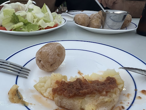 Read moreDon't expect flowers and silver service. Do expect charming wait staff, salt of the earth type, who know their menu and product, and meat. Just basically meat - and really good cuts, cooked just right over wood. My new guilty pleasure - papas arugadas con mojo. Literally just whole, un-skinned, small potatoes cooked in salt water (traditionally that would be a bucket of sea water), on the wood stove, then served with a pot of mojo picón (olive oil, garlic, coriander, paprika, cumin and other spices) With a smokey taste about them, I have no idea if this is the right way, but I just bashed them with my fist, poured on some mojo picon and chowed down. Yum, yum The setting is like a school lunch room, but outdoors and with 100%...