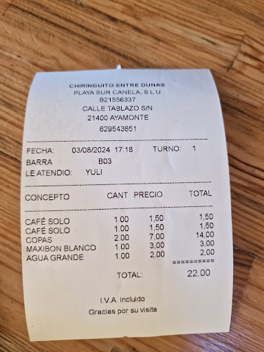 Read morePongo una estrella porque no se puede menos. Acabo de comer en este chiringuito y no sé por dónde empezar. No es la primera vez que venimos porque es el único chiringuito en el que se puede comer en esta zona de la playa pero esta vez ha sido desastroso. La comida MUY MALA y muy poca cantidad. Además pedimos pijotas (las tienen en la carta) y nos han timado, han puesto pescadillas cortadas y fritas (adjunto foto). Si no tienen pijotas no pasa nada pero que no pongan otra cosa y lo cobren como tal. Pedimos presa y por 18 euros nos trajeron un plato con tres trozos pequeños de carne sin sal y muchas patatas fritas. UN TIMO en toda regla. Teníamos reserva a las 15:30. Llegamos puntuales y entramos en el chiringuito. Enseguida una camarera con mechas azules de muy malas formas nos dice que nos quitemos de en medio. Le comentamos que tenemos reserva y ella nos regaña diciendo que le da igual, que tenemos que esperar fuera porque ahí están sacando platos. Nos movemos fuera y esperamos unos 15 minutos al sol a las 15:30 un 9 de agosto. Por fin llega un hombre a sentar a los que estábamos esperando (todos con reserva) y queda claro el caos que tienen en las mesas. Un desastre tanto de gestión, de trato y de comida. Como colofón a la comida, se fue la luz y los ventiladores dejaron de funcionar. No volveremos nunca y nunca lo...