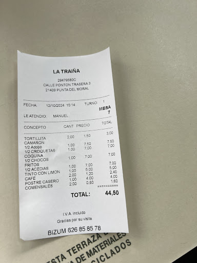 Read moreWe went to eat at this restaurant, 7 people, the service was terrible, They didn't even give us the menus with the food, we had to ask if they had it, we placed our order when we went to pay we noticed that he was charging us 18 euros for something that in the Menu said 15, he refused to make the 15 euros because we were foreigners , and gave some excuses that didn't make sense, He charged 5.60 euros just because we were in the restaurant, the final bill was 150 euros and we didn't eat much, and right at the beginning we heard the owner ask the employees in Spanish if we were foreigner , we are left with the feeling that we have been...