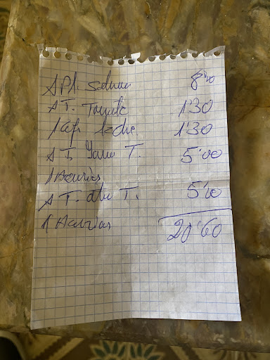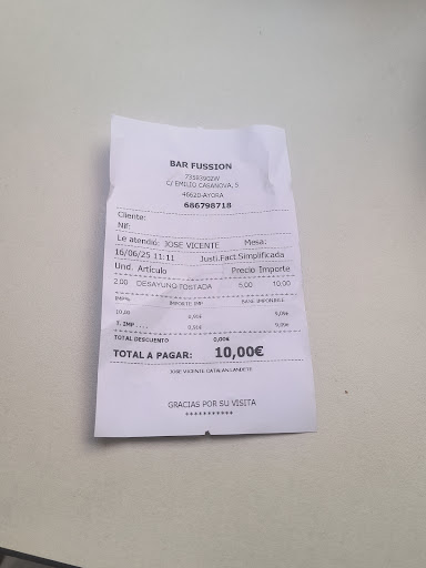 Read moreLo comparto porque es la tercera vez que nos pasa, te cobran cada vez una cosa distinta por los mismos productos; la primera vez se lo decimos y nos devuelve 4€ porque se había equivocado, hoy vemos exagerado el precio y pedimos el tiquet, la respuesta es que no lo hacen pero nos trae un papel escrito donde aparate de que según ellos nos habían cobrado 60cts de más , observamos que intentan cuadrar el precio y para ello cobran de una tostada de salmón con queso fresco 8€, la cual iba sin pan, aquí dejo el tiquet que nos han dado para que lo comprobéis. Por favor que revisen este bar para que haya una carta de precios y estén obligados a dar el tiquet conforme...