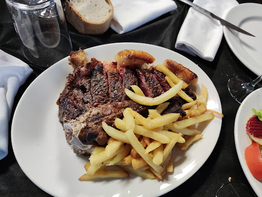 De segundo me pedi codillo (queria cabrito pero el señor de al lado se pidio la ultima racion…🥲) y mi amigo entrecot, que tenia suplemento de 5€. Con guarniciones de patatas caseras y sus piquillos. Los postres caseros, todas las tartas estan buenas, las natillas y el arroz con leche…pero tengo que recomendar su particular torrija de brioche, espectacular. El menu del dia sale a 18€ con IVA sin bebidas, precio buenisimo teniendo en cuenta lo bien que se come. El sitio esta un poco lejos, pero merece la pena, tiene unos parajes muy bonitos y fuera hay unas piedras para levantar si alguno se siente con...