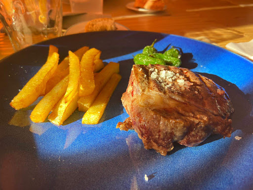 La comida, excelente. De entrada, huevos a baja temperatura sobre cuna de patata y torreznos que hacen saltar las lágrimas, croquetas muy ricas (esta vez unas de queso y las otras de osobuco) y berenjenas con miel.... de segundo, solomillo de ternera tierno y cocinado al punto, chuletón de kilo para dos personas espectacular y chipirones en su tinta como los que hacía mi abuela... de untar pan 😃. De postre souffle de chocolate con helado de vainilla muy rico y tarta de manzana.