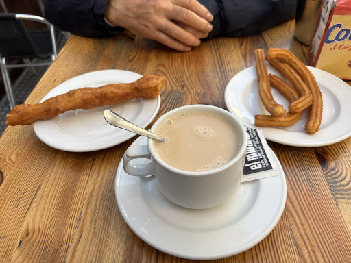 Read moreHe desayunado allí, el local es algo estrecho pero tienen dos terrazas en las que se puede estar muy agusto aunque haga frío. Si vas a primera hora mejor para no tener tanta gente y la cocina se atasca un poquito. Los churros están muy buenos, la masa está crujiente por fuera y esponjosa por dentro, son en formato bastoncillo en vez de lágrima, cosa a tener en cuenta al pedir la cantidad. Las porras no están mal, pero si tienes dudas tira por los churros sin dudarlo. Las porras son algo grasientas por fuera y por dentro están bastante crudas en algunas zonas ya que la porra tiene un tamaño muy irregular. Es extremadamente crujiente por fuera. El tamaño es algo pequeño, pero el precio es correcto. El trato no es especialmente amable, pero hacen su trabajo, que es lo importante. Ojo, solo se puede pagar en efectivo. Dos cafés grandes, 4 porras y 4 churros (4 bastones más o menos como 2 churros clásicos) por 6,20€. No puedo hacer precio comparativo con el resto de la zona, pero no me parece excesivo. Como resumen, si estás por la zona y te apetece unos churros, es una...