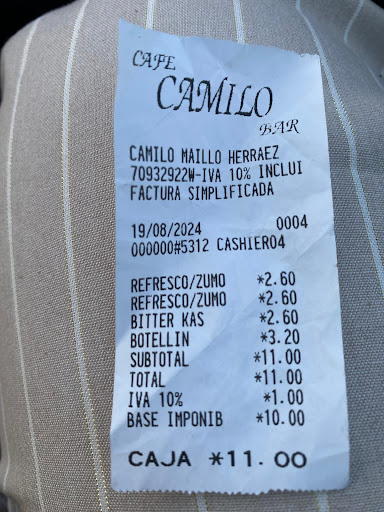 2 coca colas , 1 bitter y una caña 11€ . Sin tapa ... En réplica a su respuesta, añado el ticket para que usted sepa lo que cobra. Efectivamente, es beber en una terraza puesto que no hay servicio de terraza, ustedes abren las botellas de coca cola y bitter, nosotros mismos nos las servimos en un vaso (con hielo ni siquiera limón), y cobran como botellin una caña en vaso de sidra. Y además nosotros mismos acercamos la bebida a la terraza. Dentro de mis posibilidades intento que no me tomen el pelo. En la misma calle se encuentra la Heladeria Italiana donde nuestra experiencia como clientes resulto mucho mas safisfactoria .