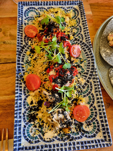 Read moreLlamamos con muy poca antelación para reservar y estuvimos comiendo en una mesa alta de la entrada, que son bastante cómodas para ser mesas altas (pero recomiendo reservar con antelación porque la sala es preciosa y tienes bonitas vistas del pueblo y la montaña). La chica que nos atendió fue muy simpática a pesar de estar el restaurante completísimo y nos atendió muy bien, acordándose en todo momento de lo que tocaba y avisándonos si había algún pequeño retraso. Probamos el paté de perdiz, que estaba bien, el tartar de salchichón que estaba muy bueno, las pastelas de pollo también (aunque hubiera estado mejor si estuvieran a temperatura ambiente y no frías, ya que el frío se llevaba parte del sabor, algo que nos dimos cuenta con las croquetas de pollo moruno, que tenían el mismo sabor pero al estar calientes lucían más. También probamos las gyozas de gamo, rellenas de un guiso muy rico, las albóndigas de ciervo que fueron mi plato favorito, con salsa de yogur y curry rojo, muy conseguidas y una carne ibérica a la brasa muy correcta, creo que lagarto. De postre tomamos el chocolate en texturas (a mí no me gusta el chocolate así que no puedo valorar), la tarta de queso que estaba muy buena (me sobraba el dulce de leche pero afortunadamente estaba aparte) y la selección de postres morunos que eran cuatro y había un par muy muy ricos, especialmente uno de avellana, mi favorito con las albóndigas. Para acabar un mojito moruno que es como un mojito normal pero con té moruno y le daba un toque diferente y divertido. Con ganas de volver y probar otras cosas y repetir otras, muy buena opción para comer cocina de raíz con un toque moderno en Baños...