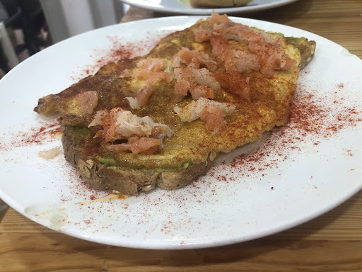 Read moreFuimos 7 personas un miércoles a desayunar, cuándo llegamos no había mesas libres pero esperamos un poco y nos sentamos. Pedimos cafés variados, de tostadas 2 de mantequilla, Sabrosa (huevos revueltos y jamón), Picada (salmorejo y jamón), Ratona (rulo de cabra y nueces) y por último una Noruega (base de guacamole, tortilla francesa, salmón y bacalao ahumado). Curiosos y originales nombres. Todas estaban buenas, destacar la Sabrosa, muy rica, huevos muy jugosos, y la Noruega con la combinación perfecta de sabores, exquisita. Personal...