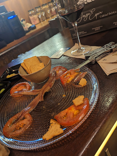 We were happy to find this place. We were excited to see the tapas offered. Upon entry we sat at the bar. The bartender with the glasses and short hair immediately made us feel uncomfortable. He kept mumbling under his breath. He clearly did not want to talk to our type. We managed to get two glasses of wine and two tapas out of him. Our food arrived and we waited and waited for silverware, nothing. So we used our multi tool. (As pictured) In addition the ladies room was not properly taken care of as it had no toilet paper. It is an absolute shame as we would have loved to order more tapas and enjoy this place. Definitely would recommend spending your...