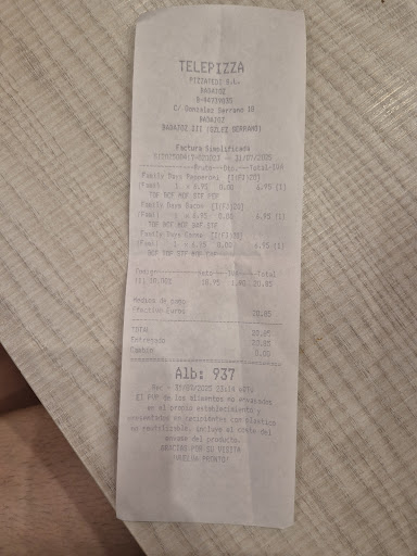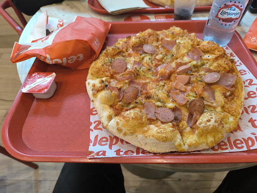 Read moreBueno pues muy a mi pesar el primer telepizza en el que lo pase realmente mal y la verdad frecuento esta franquicia en diferentes lugares muchas veces. Al entrar pudimos detectar un olor que muy lejos de ser normal era totalmente desagradable, algo asi como a calcetin sudado mezclado con lejia y olor a wc sucio, al atendernos el empleado pudimos observar que iba con la indumentaria totalmente manchada. Las pizzas, aunque conservan el sabor original de telepizza tenian una masa fina cual papel de fumar con bordes que parecian mantecados de cajon debido a su desproporcionado grosor totalmente contrario a la masa en general. El empleado tampoco nos explicó la oferta del family days y acabamos pagando mas de lo que teniamos previsto. En definitiva el unico telepizza en que no vuelvo a pisar.
