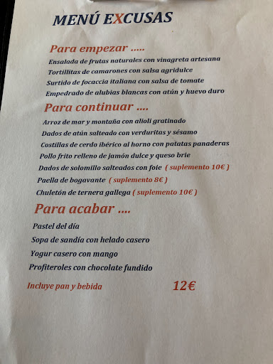 Read moreRestaurant de menú al que he arribat per casualitat. Anava a Can Mario’s i a l’estar ple el cambrer m’ha dit “si necessites dinar ara i per aquí només et recomano l’Excusas que està aquí al costat. No esperis trobar el nostre menú”. Així doncs he fet un menú el menú que veieu a la foto. El menú, primer m’han servit com aperitiu una croqueta, no m’ho esperava i m’ha sorpès. Després he triat de primer unes truitetes (dues) de camarones que m’he pensat que eren un altre aperitiu 😏. M’han decepcionat bastant, estaven massa fetes i jo m’havia imaginat una truita d’ous amb gambetes i no de farina. Error meu per no preguntar o no ser un client habitual. A continuació ha arribar l’arrós, en paella individual que m’han servit al plat el mateix cambrer. L’olor era magnífica, com de brasa, però hi havia com un flam d’allioli (amb ou) que es trobava en estar massa sòlid per barrejar-lo amb l’arrós. El plat d’arrós és abundant però ha vingut massa calent per disfrutar-lo des de bon començament. Si a aquest arrós li treuen el “flam” d’allioli i el serveixen menys calent seria un plat rodó. L’arrós estava al seu punt i tenia un gust rodó. Per acabar he demanat de postres iogurt casolà amb mango. Correcta i la fruita era fresca i tallada a mà, no confitada. Amb el menú hi ha beguda (he demanat aigua i me l’gan portat de 33cl, llàstima) i el pa que no he tastat però que semblava correcta. L’atenció ha estat ràpida i professional però la típica d’un lloc “ranxero”: sense massa simpatia i anant per feina, el local estava ple i la terrassa també. El preu pel que he menjat m’ha...