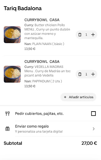 Read moreVuelvo a dejar mi reseña explicando la situación. Nosotros hemos ido alguna vez a cenar y la comida, precios, cantidades y trato siempre ha sido excelente. Anoche decidimos pedir a domicilio a través de la app y nos llegó muy poca comida en comparación a lo que comes en el restaurante (que en parte, puedo entenderlo). Mi queja sobre ''nos llegó solo arroz por 27€'', no es porque me parezca caro, el Curry Bowl vale 13€ y es un precio decente, lo que me parece incorrecto es que si te pides el mismo bowl en restaurante te incluye: arroz, curry, bebida y pan naan. Sin embargo a domicilio solo te incluye: arroz, curry y pan. Lo raro es que nuestros platos casi no tenían curry, vamos que eran 90% arroz (adjunto foto donde se ve que hay 2 trozos de carne y a tope de arroz). O sea que si, por 27€ cenamos puro arroz. Lo intentamos solucionar desde la app antes de dejar una reseña y no pudimos (y los dueños no deberían hacernos sentir mal por dejar una review honesta, como hicieron anoche, porque era una reseña respetuosa y con intención de mejora, para eso sirve esta herramienta). Por lo demás, veo bastante fuera de lugar que en un comentario anterior los dueños empiecen a exponer todas las cosas que hemos comido en anteriores ocasiones porque no viene a cuento. Nos gusta mucho este restaurante, por eso espero que mejoren la calidad. Por mi parte he de decir que la respuesta pasivo agresiva a mi reseña de anoche me hizo sentir incómoda y me da pena porque no creo que vuelva...