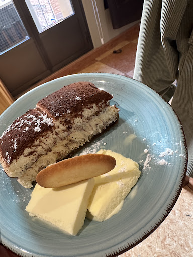 Pedimos dos menús del día (el fin de semana el precio es de22€). Primeros platos: dos pochas con chorizo; segundos platos: un balacao a la riojana y unas chuletillas de cordero; postres: una tarta de queso y un tiramisú.